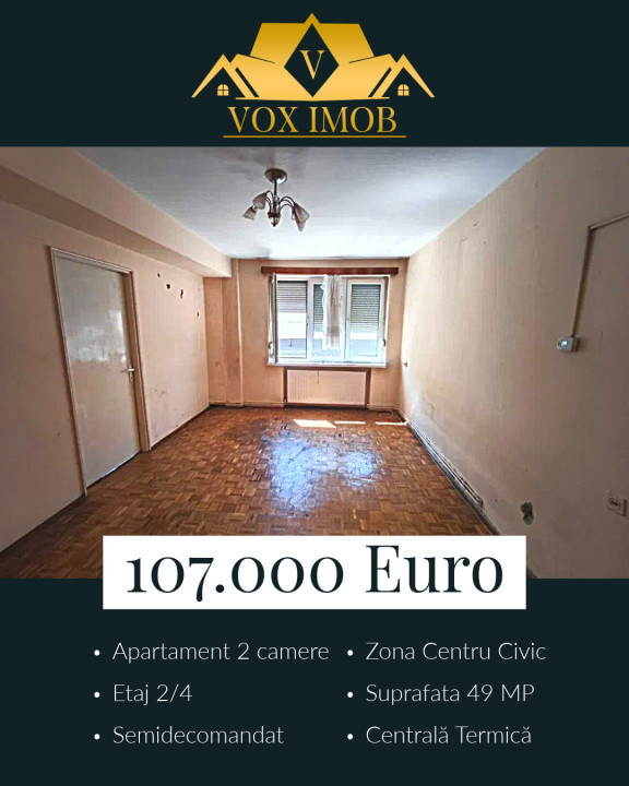 un apartament cu 2 camere, semidecomandat, situat la etajul 2 din 4, într-una dintre cele mai dinamice și bine cotate zone ,Centru Civic.